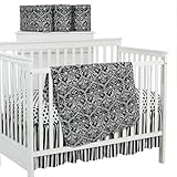 Black and White Damask 4-Piece Crib Set - The 4-piece set includes a reversible damask/polka dot cotton bumper and coverlet, a boldly dotted fitted crib sheet and a gathered crib skirt in a beautiful bold stripe.