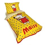 Your child will sleep like royalty in this Queen Maisy toddler bedding set. In this Maisy adventure, everyone?s favorite mouse is ready to rule bedtime with her crown and scepter. Regally clad in red, Maisy stands out against the vibrant yellow pillowcase and comforter that are spotted with big, blue polka dots. The sheets are a coordinating yellow and white stripe. This toddler-sized set is made of 100% cotton and includes a fitted sheet, top sheet, pillowcase, and polyfill-stuffed comforter. The bedding is machine washable.